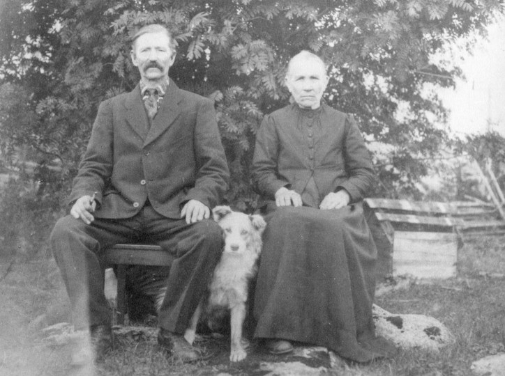 Gunnels fammo och faffa, Johan och Anna. I mitten hunden Nero som Gunnels pappa håller i där bakom. De var finskspråkiga båda två och bodde i norra ändan av gården i Gränden när Gunnel växte upp. Han var lång och hon var kort. De var varmt religiösa och Gunnels pappa fick hämta prästen Söderholm med jämna mellanrum som kom och hälsade på och gav nattvarden.. När de sjöng psalmer och namnet Jesus nämndes så neg Anna minns Gunnel