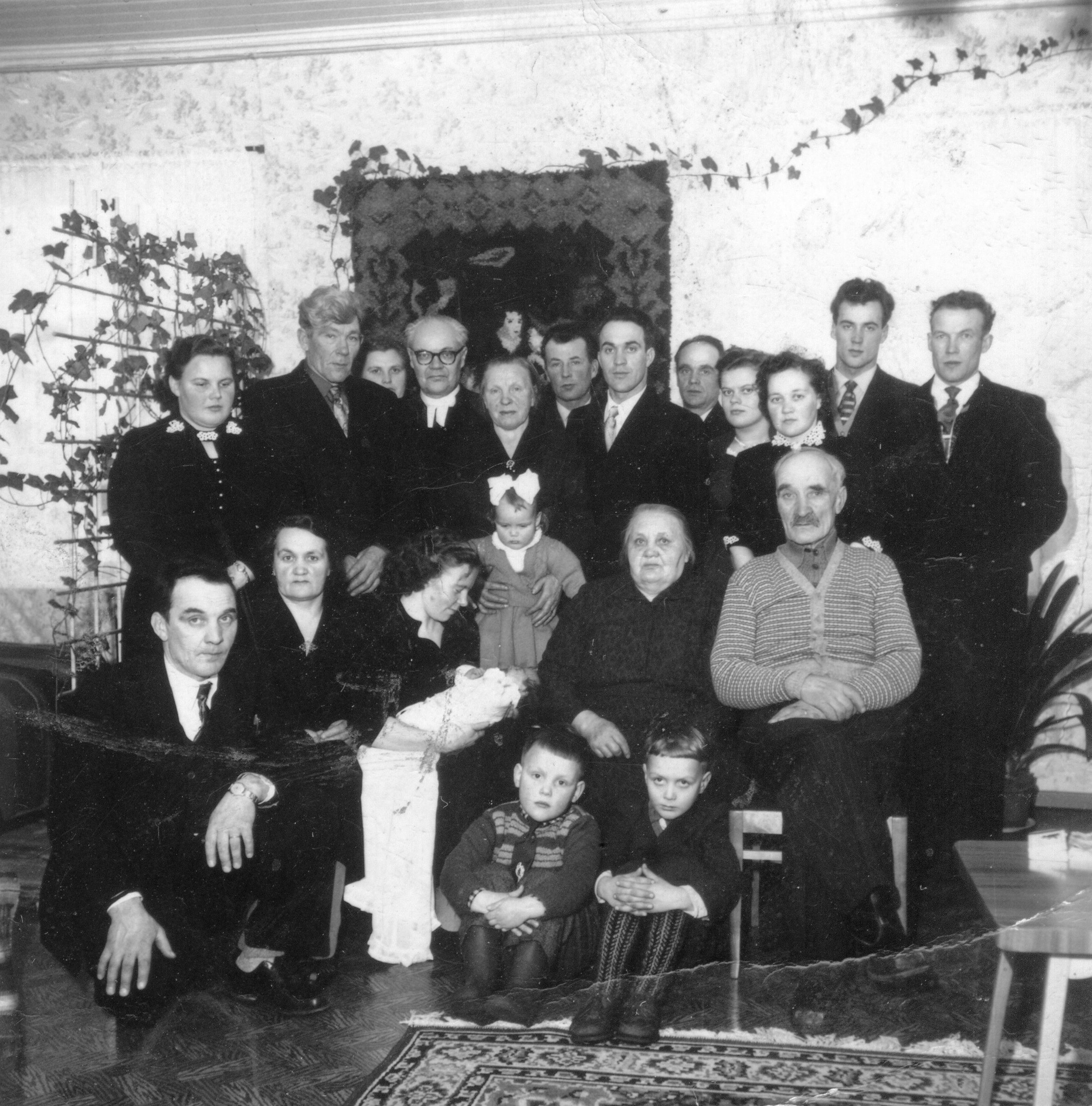 Den här bilden är från Helens dop 1957. Övre raderna: Rachel, Gunnels pappa, Lisa, Runar Söderholm, Gunnels mamma, Johannes, jag, Walter, Viva, Ethel, Magnus, Anders. Nere: Ragnar, Valdine, Gunnel, Carola i Stavas famn, mamma och pappa. Längst ner sitter: Dick och Christer