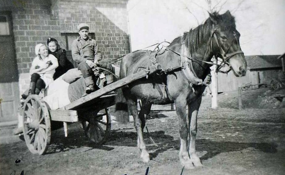 Etel Häll, Ingegerd och Åke. Åke bar upp smörtunnor som vägde 50 kg två våningar upp. Senare började de göra dem hälften mindre (25 kg) som gjorde arbetet lättare. Hästen är Fux, som också var i kriget. Läs om när han kom hem i Åkes skrift